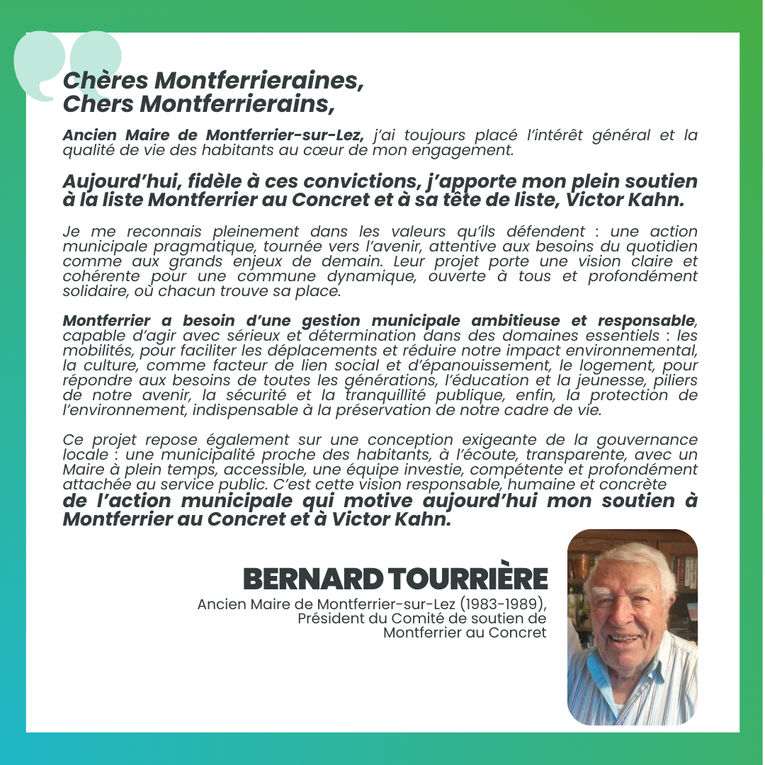 Convaincu(e) que notre commune a besoin d’un projet municipal clair, concret et tourné vers l’avenir, je partage les valeurs portées par Victor Kahn et son équipe : proximité avec les habitants, engagement au service de l’intérêt général et volonté d’agir efficacement pour améliorer la qualité de vie à Montferrier-sur-Lez.