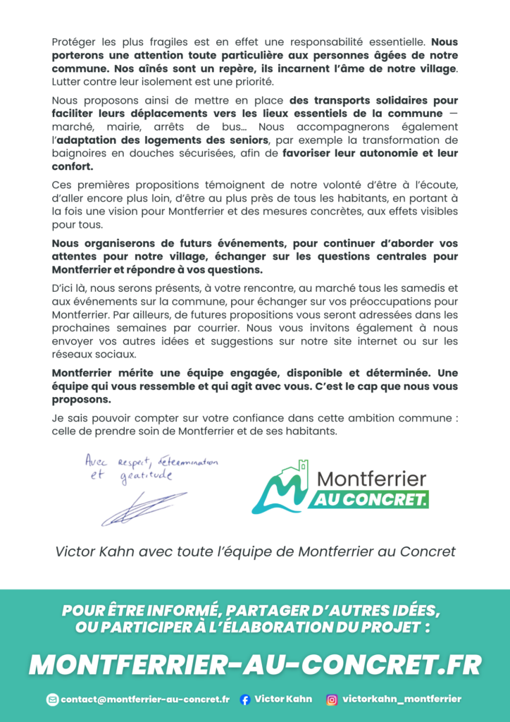 Montferrier est un village dont la beauté, la vitalité associative et l’esprit de convivialité constituent une richesse précieuse. Préserver cette singularité, répondre aux besoins du quotidien et préparer l’avenir avec sérieux : c’est ce qui guide notre démarche.
